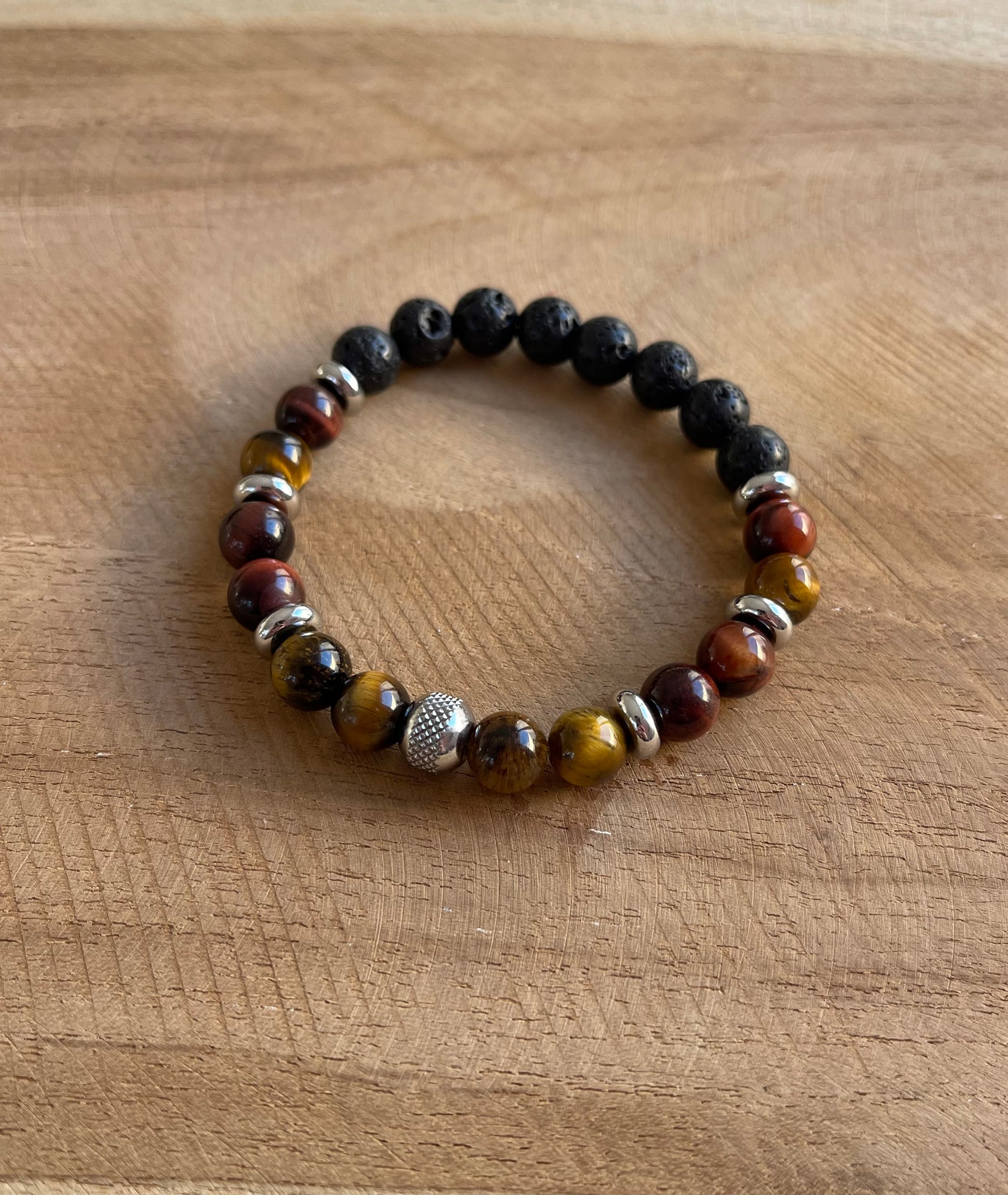 - Pierre de lave : liée au chakra racine pour augmenter la confiance en soi, la vitalité mais aussi apporter le calme, la sécurité et la stabilité . La Pierre de lave est également reliée au chakra du plexus solaire qui renforce la force vitale, le système digestif et apporte détermination et dynamisme.