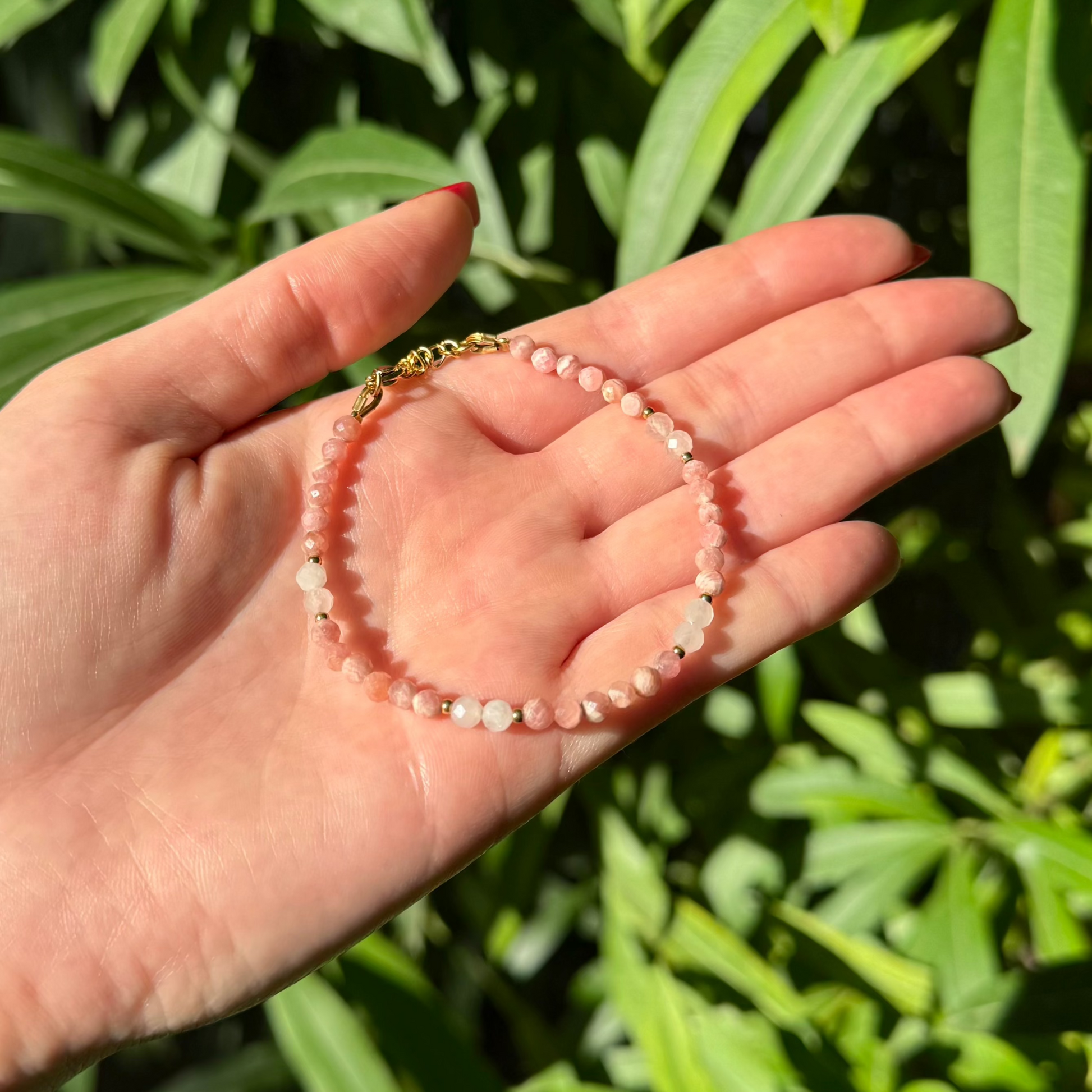 Bracelet chaine acier inoxydable en perles 4mm facettées de rhodochrosite et quartz rose.