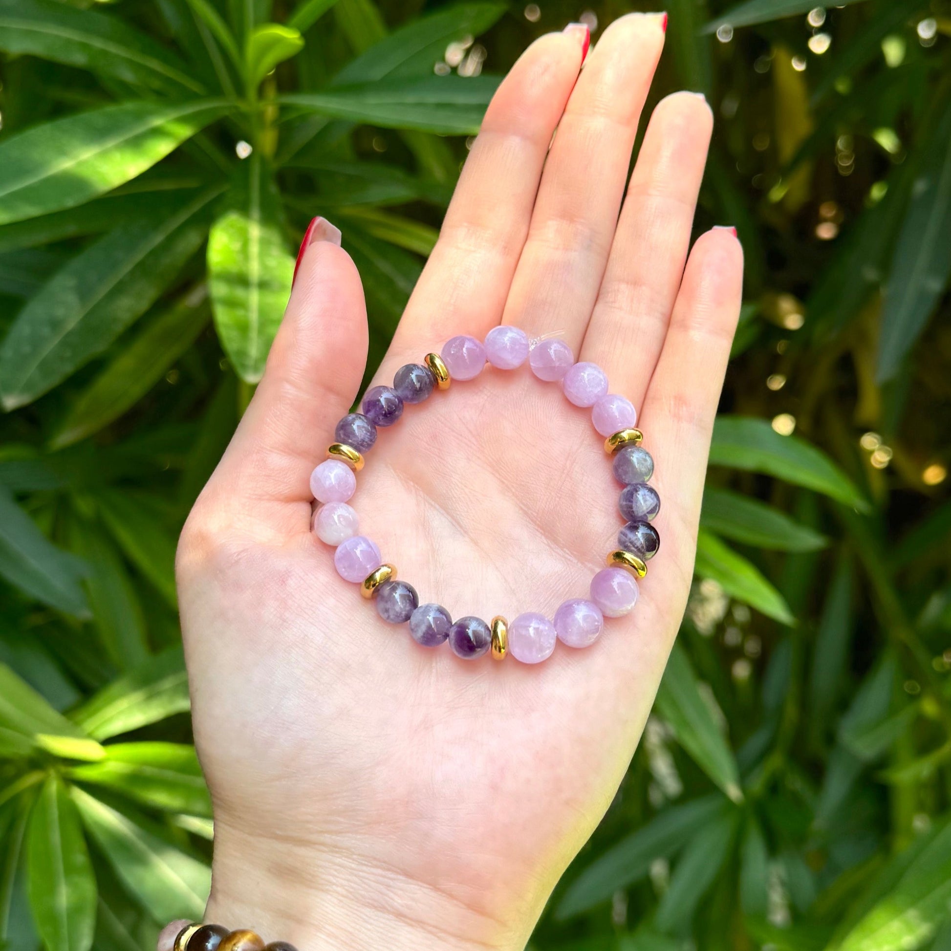 Bracelet élastique en perles d'améthyste lavande, kunzite et acier inoxydable.