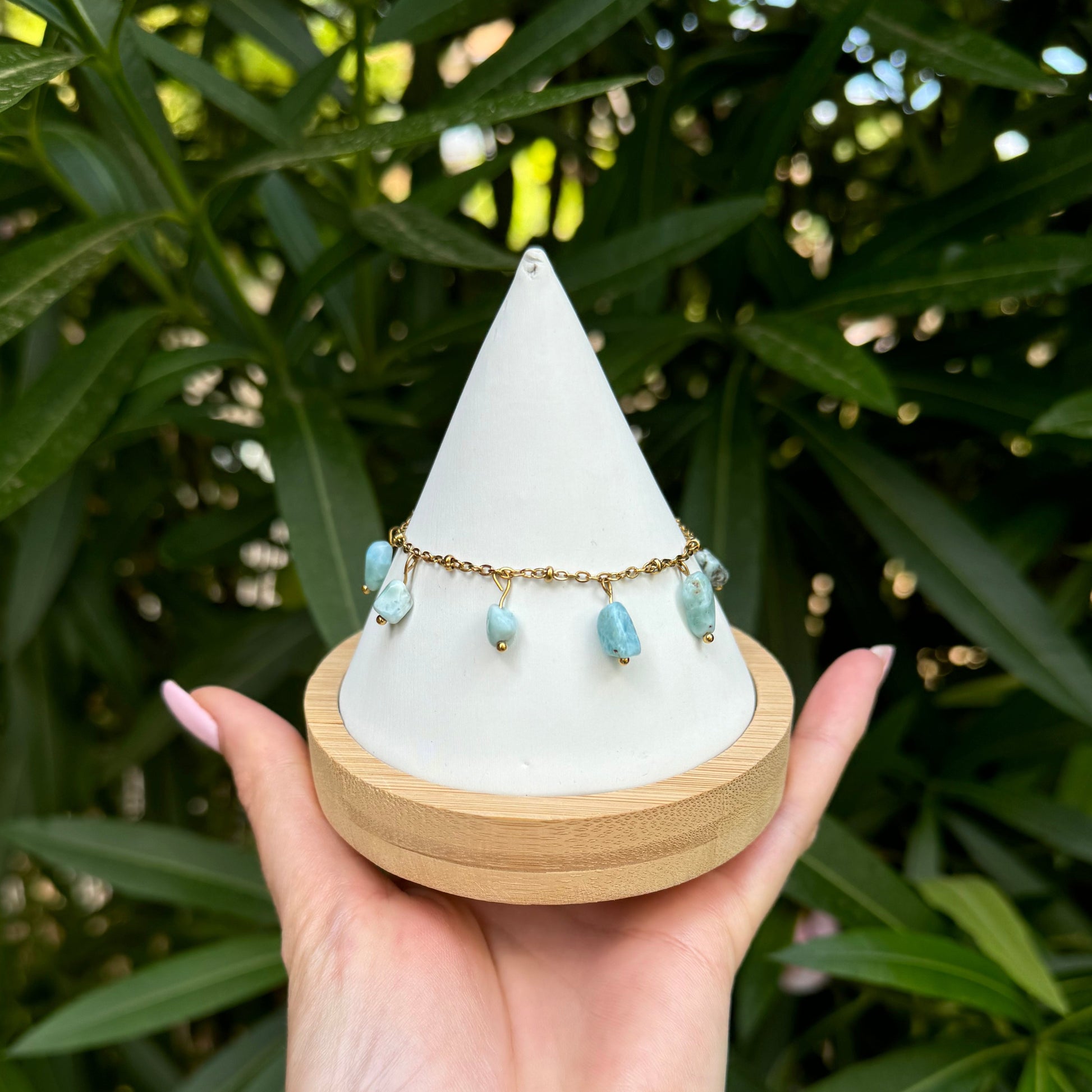Bracelet en acier inoxydable accompagné de perles de larimar.