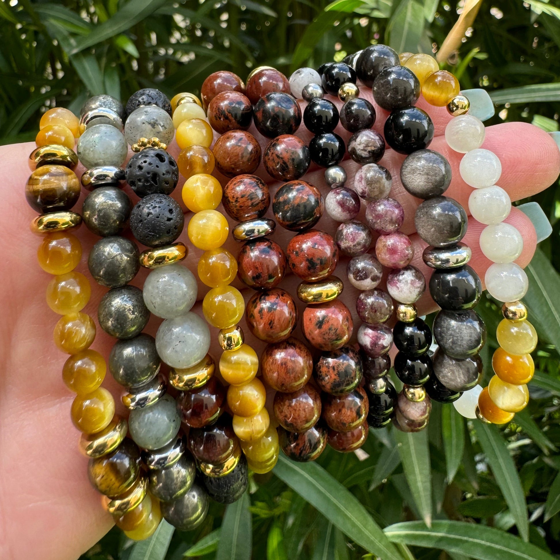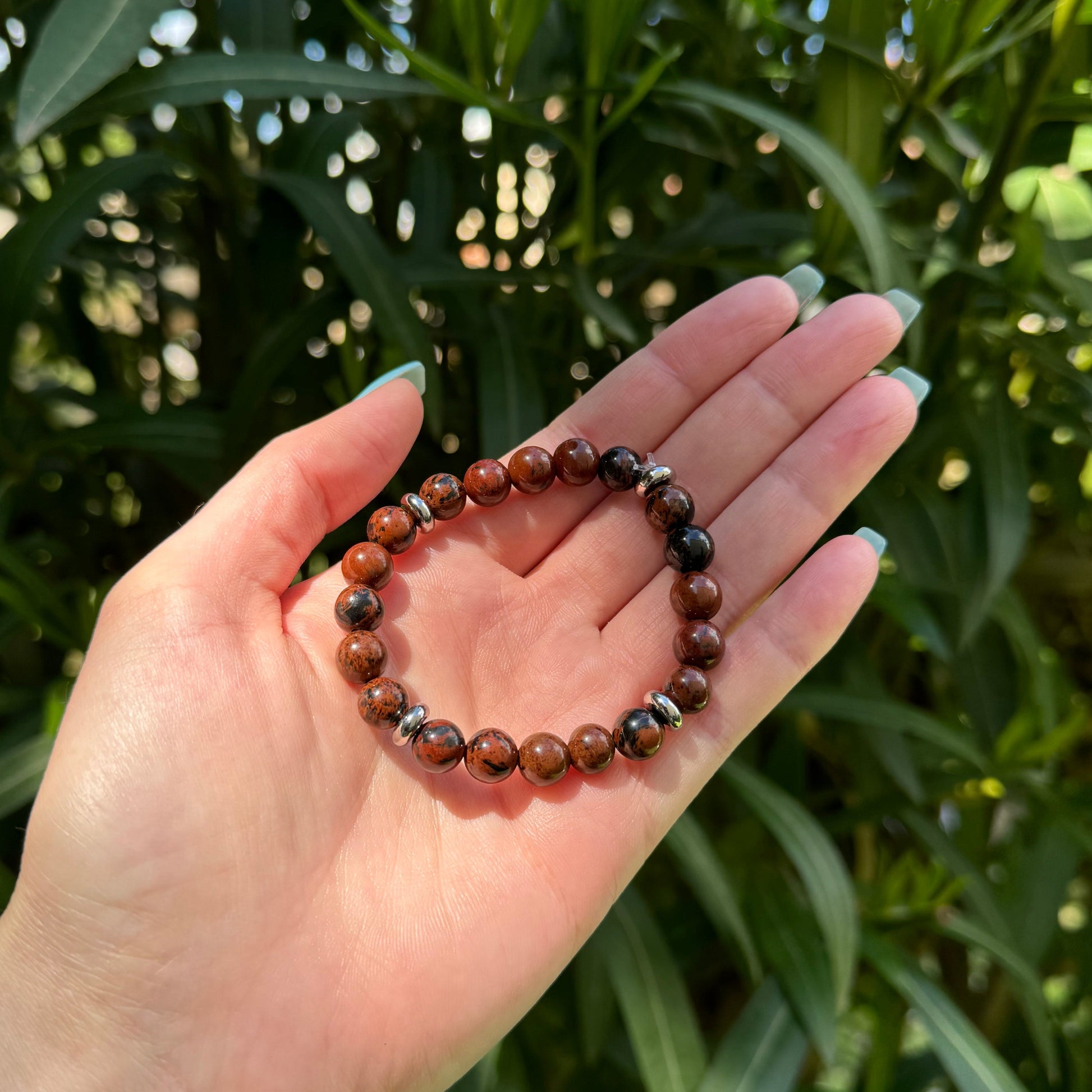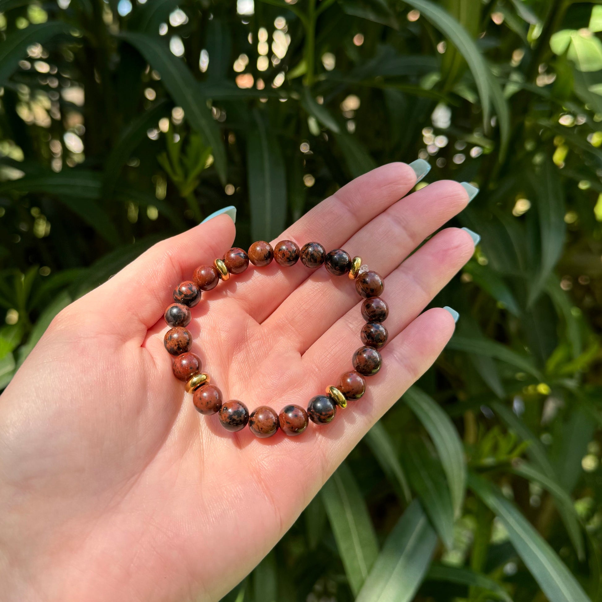 Bracelet élastique en obsidienne acajou et acier inoxydable.