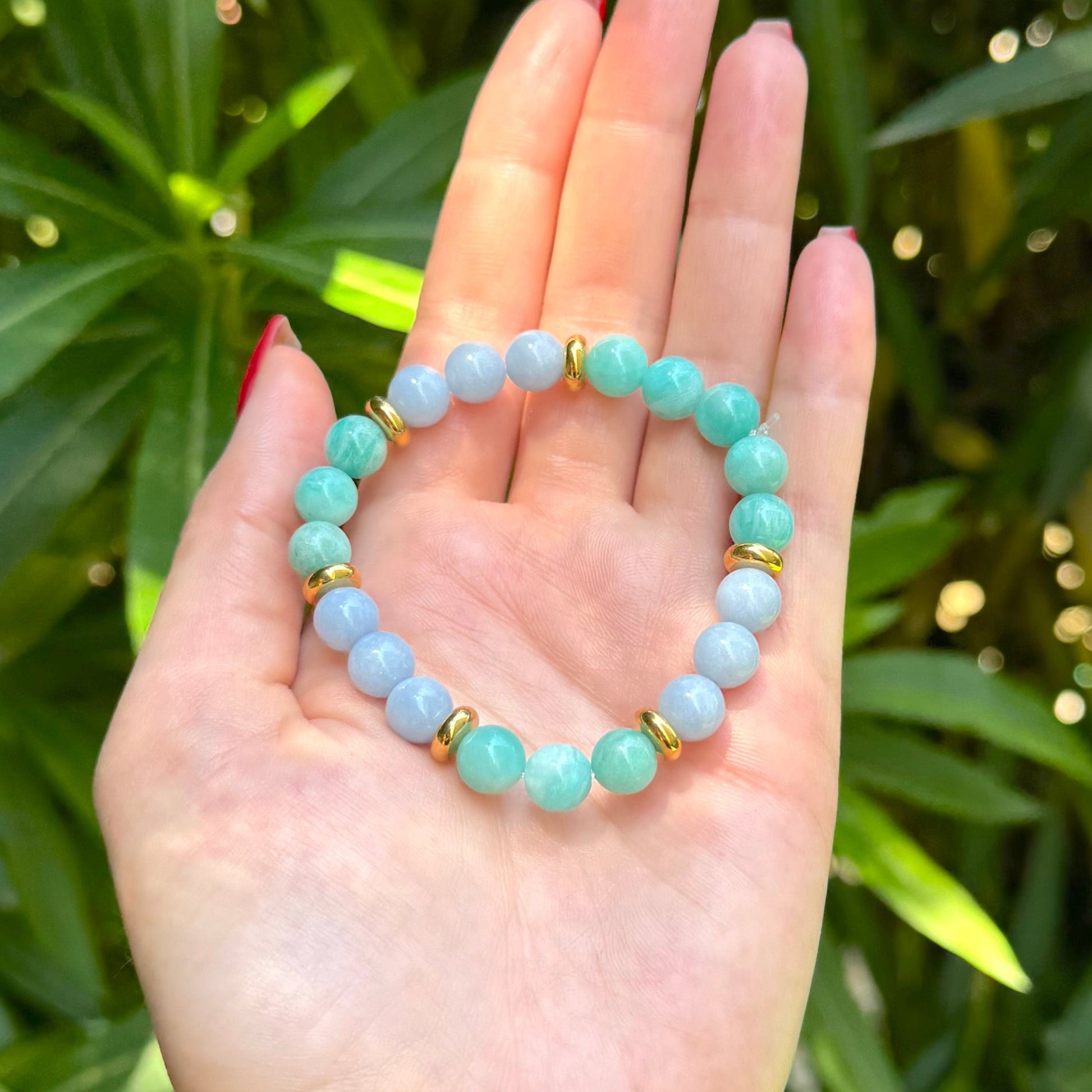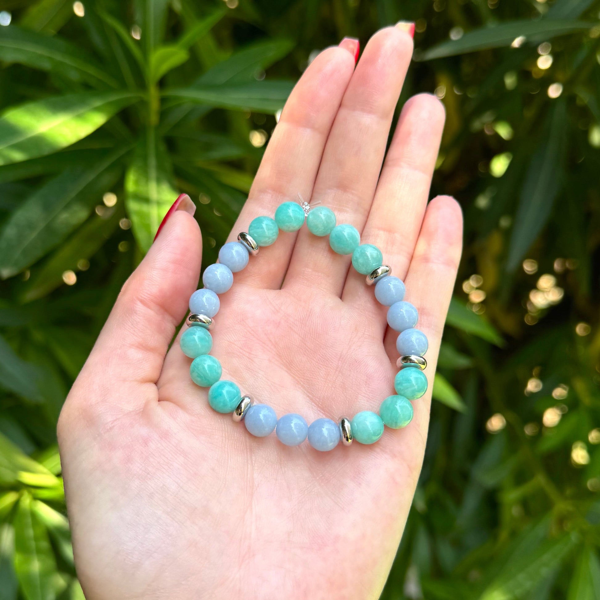 Bracelet élastique en perles d'amazonite, angélite et acier inoxydable.