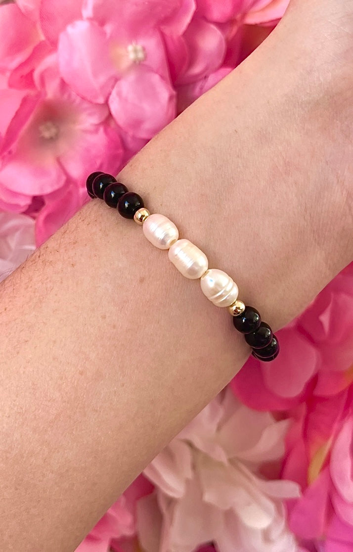 Bracelet élastique en perle d'eau douce et Onyx accompagné de perles remplies d'or 14k ou gold filled.