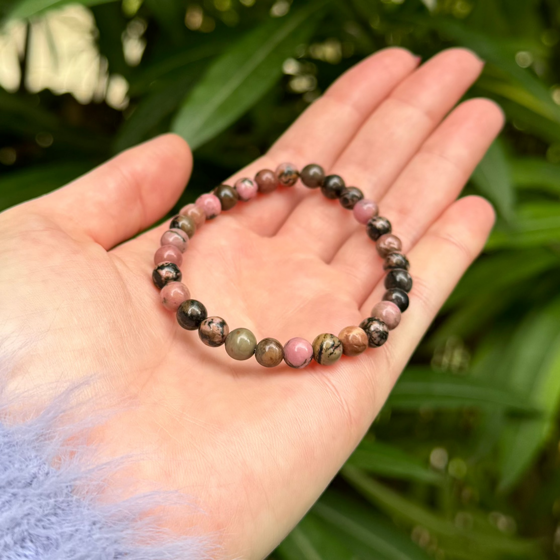 Rhodonite : Pierre équilibrante, protectrice et réparatrice. Elle calme le stress, notamment en période d'examen, et les trop-pleins d'émotions ; elle régule le rythme cardiaque et active le chakra du cœur. Elle adoucit les personnes émotives et nerveuses ou qui ont tendance à s'emporter facilement. Elle les guide vers l'ouverture d'esprit, enseignant l'écoute des autres et la tolérance.