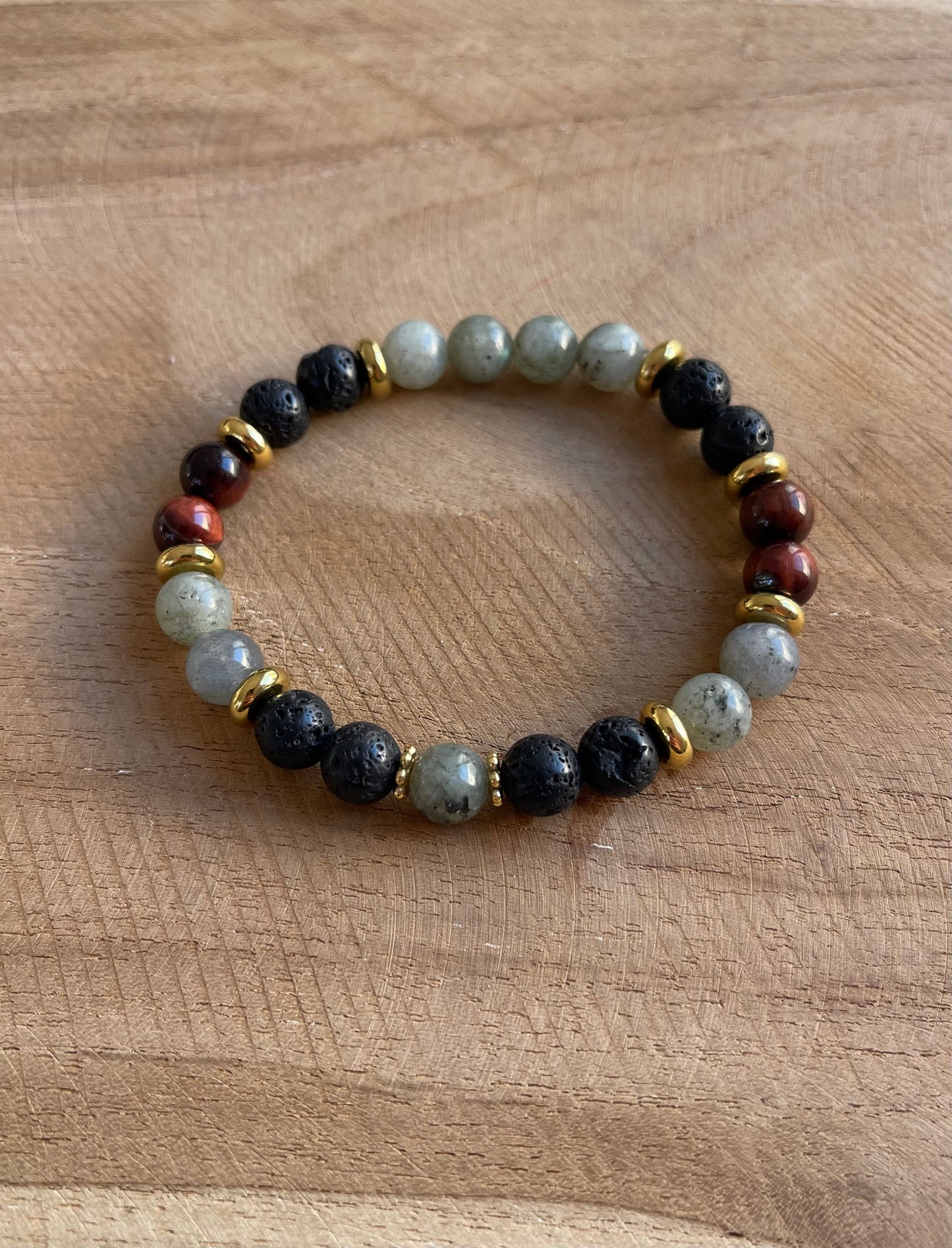 - Pierre de lave : liée au chakra racine pour augmenter la confiance en soi, la vitalité mais aussi apporter le calme, la sécurité et la stabilité . La Pierre de lave est également reliée au chakra du plexus solaire qui renforce la force vitale, le système digestif et apporte détermination et dynamisme.