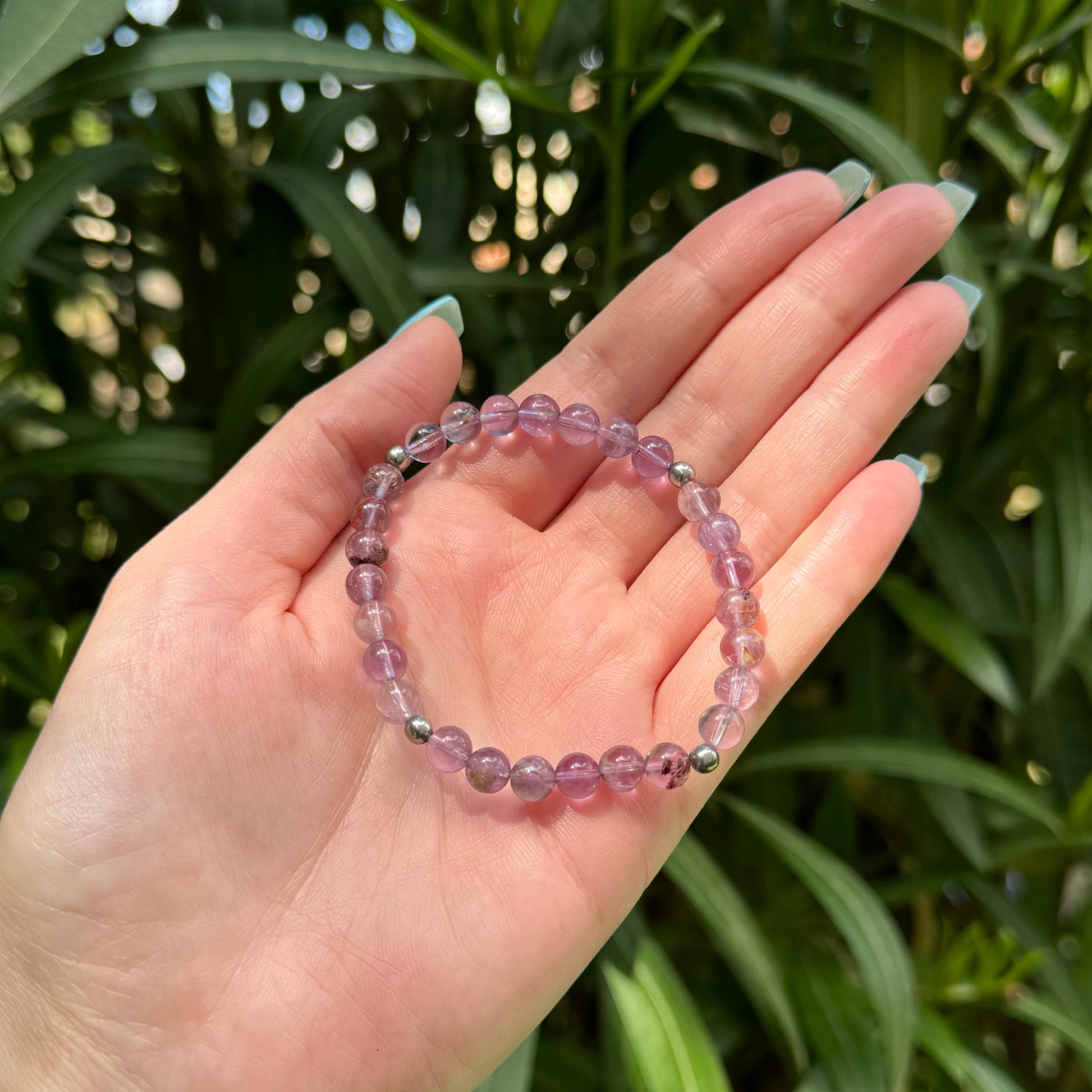 Bracelet élastique en super seven et acier inoxydable.