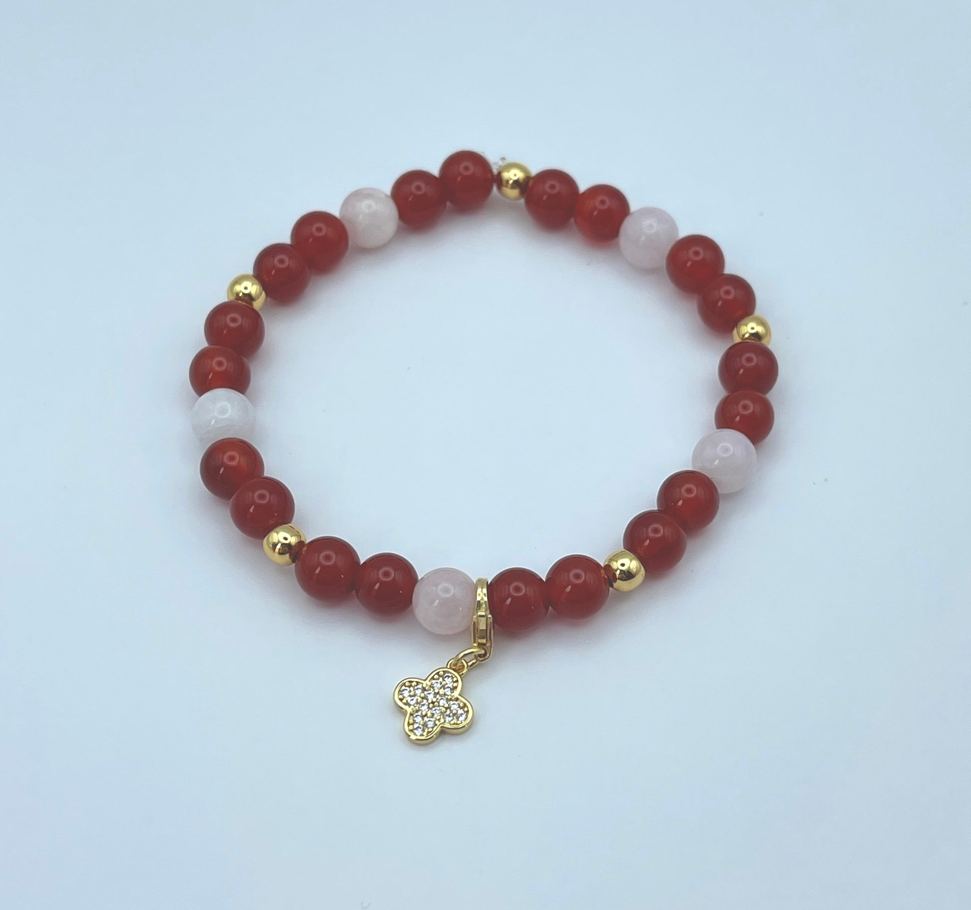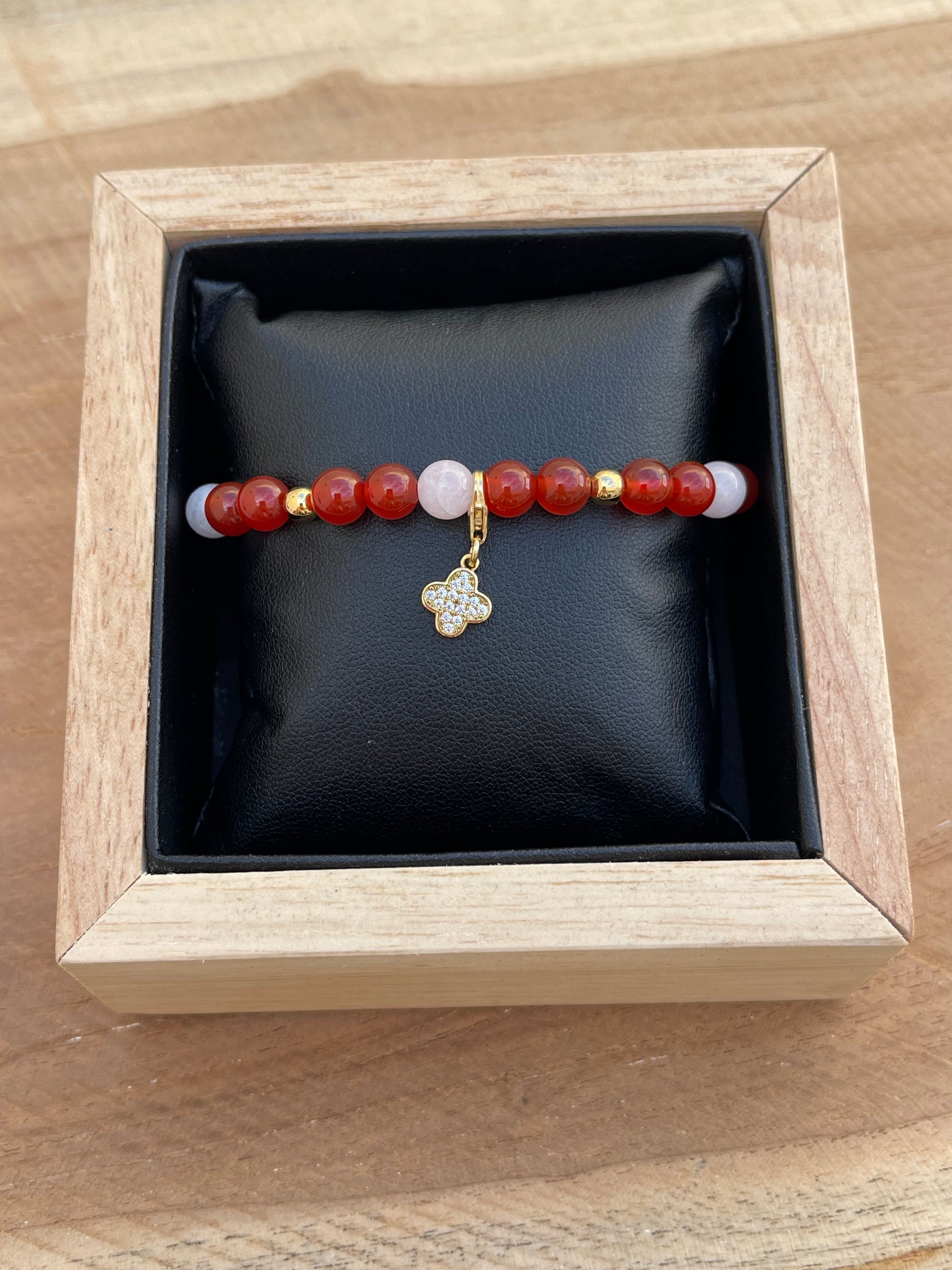 Bracelet élastique en perle de cornaline et de morganite accompagné de perles en gold filled. Vous avez également un charm trèfle en gold filled que vous pouvez retirer grâce à son fermoir.