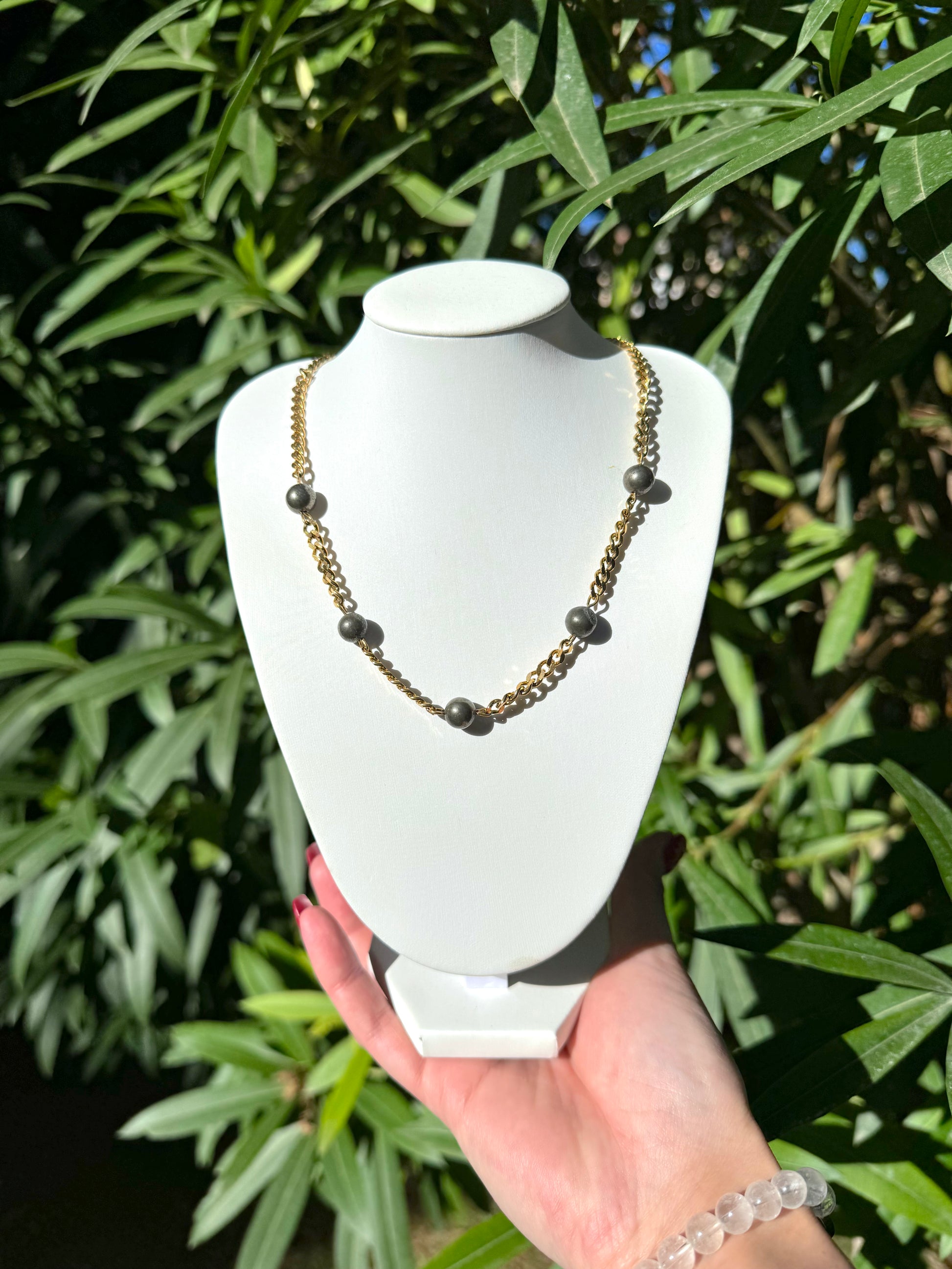 Collier en acier inoxydable fait main accompagné de 5 perles de pyrite en 8mm.