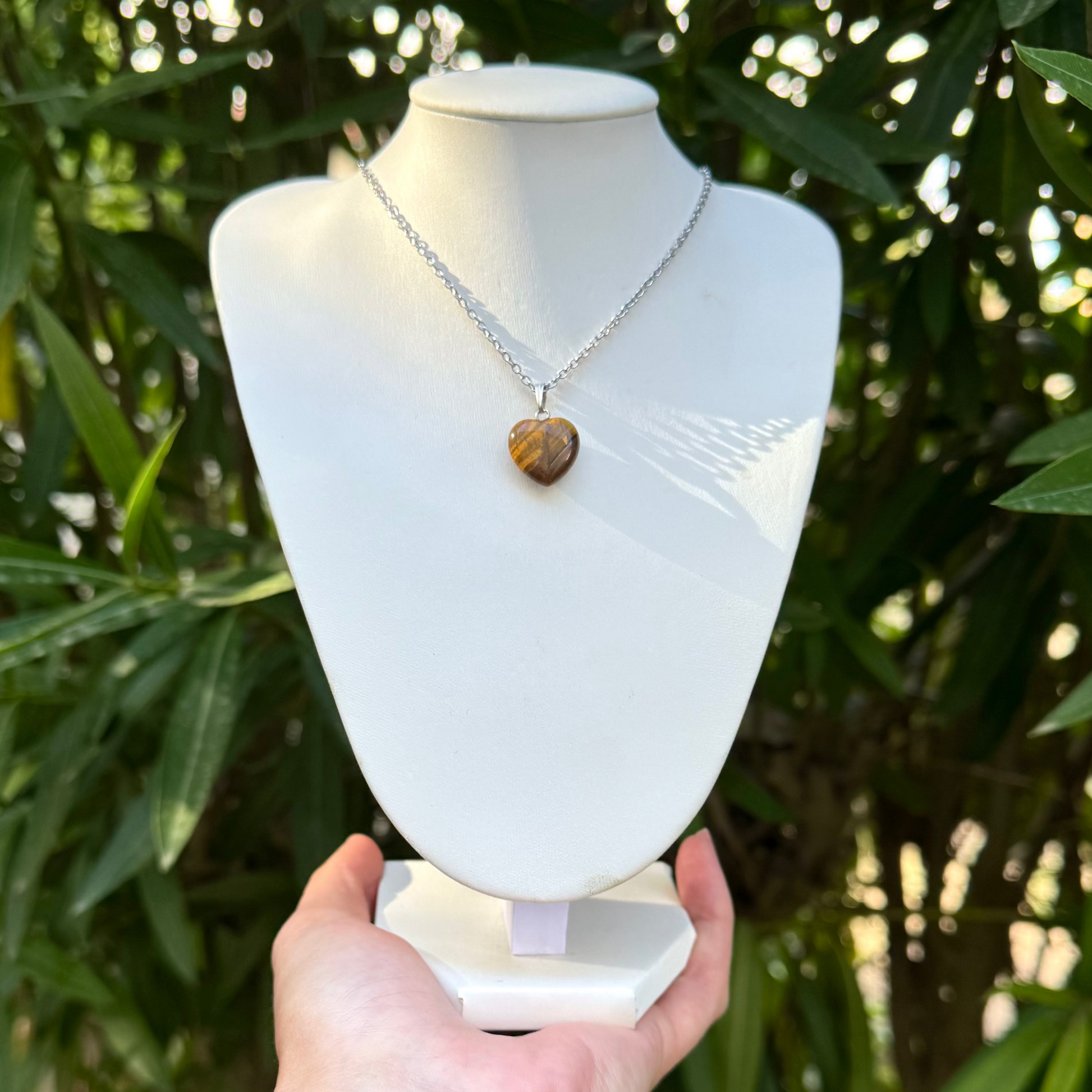 Collier avec pendentif en forme coeur en oeil de tigre et acier inoxydable.