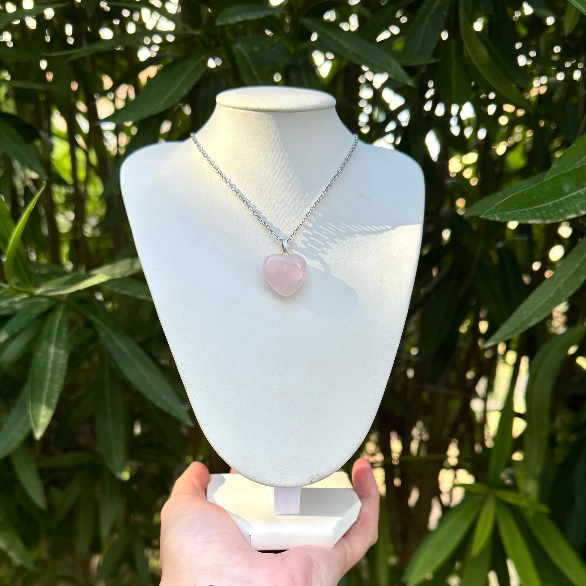 Collier avec pendentif en forme coeur en quartz rose et acier inoxydable.