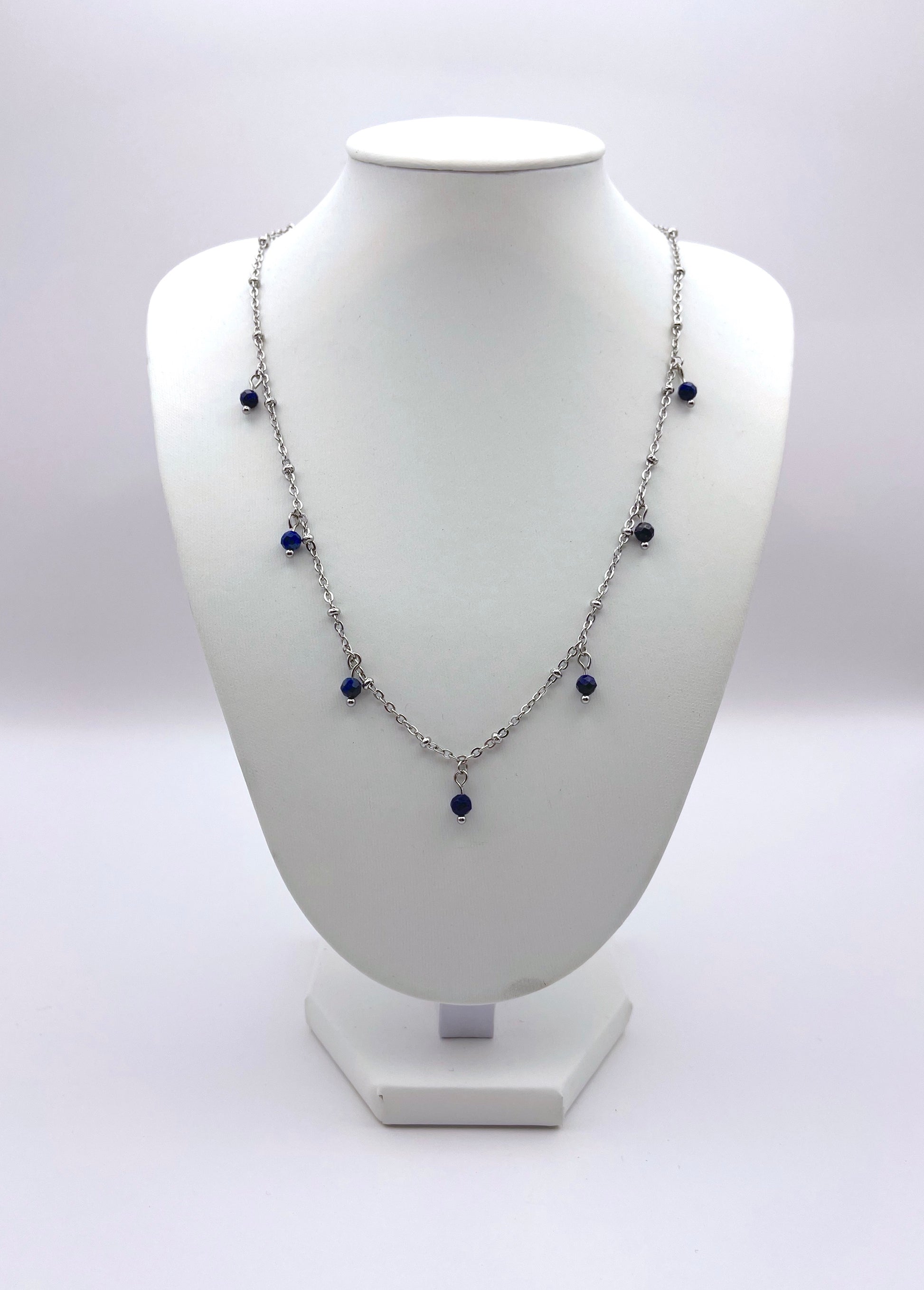 Collier en acier inoxydable fait main accompagné de perle de lapis lazuli facetté.