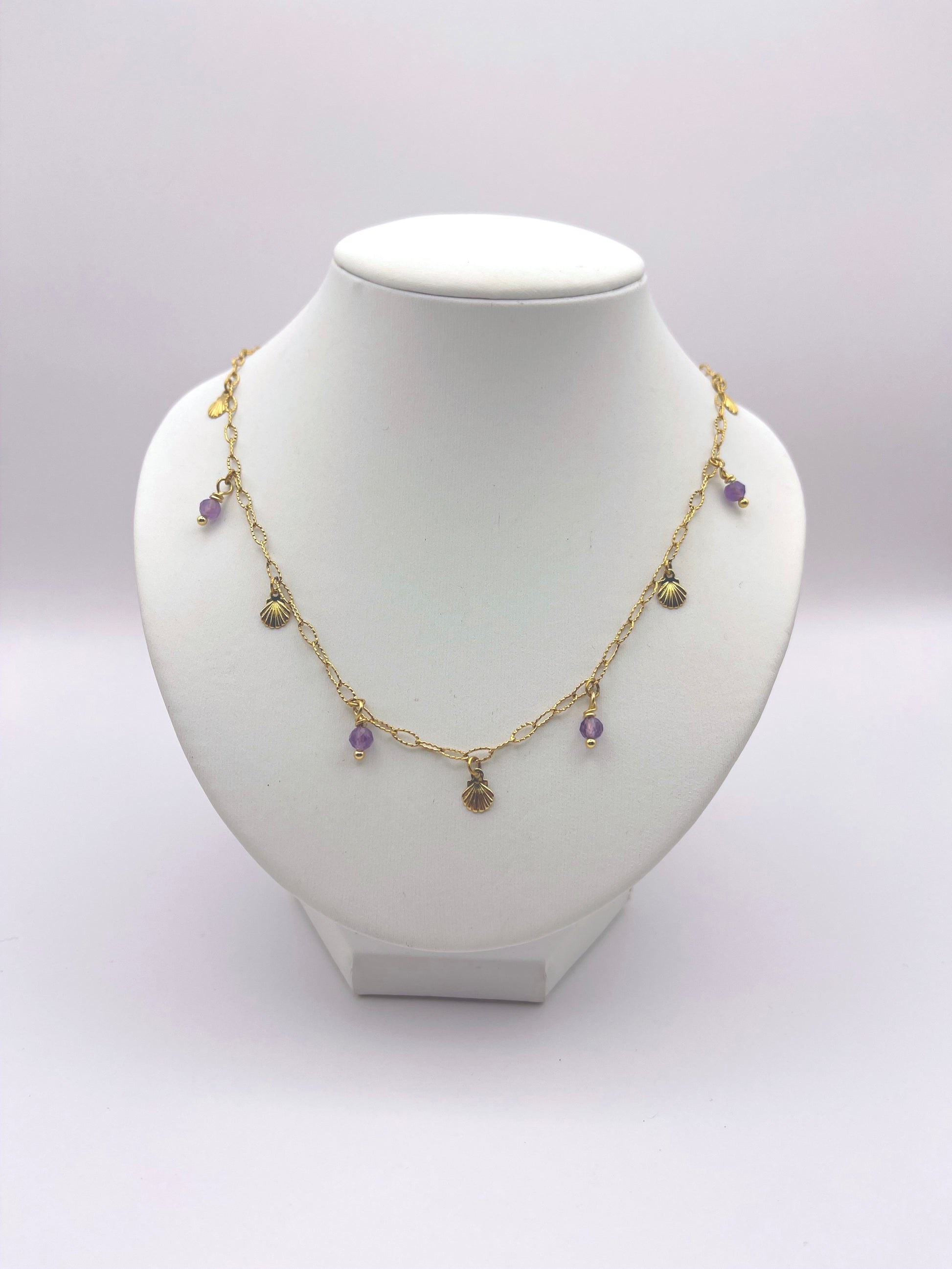 Collier en acier inoxydable fait main accompagné de perle d'améthyste facetté et coquillage.