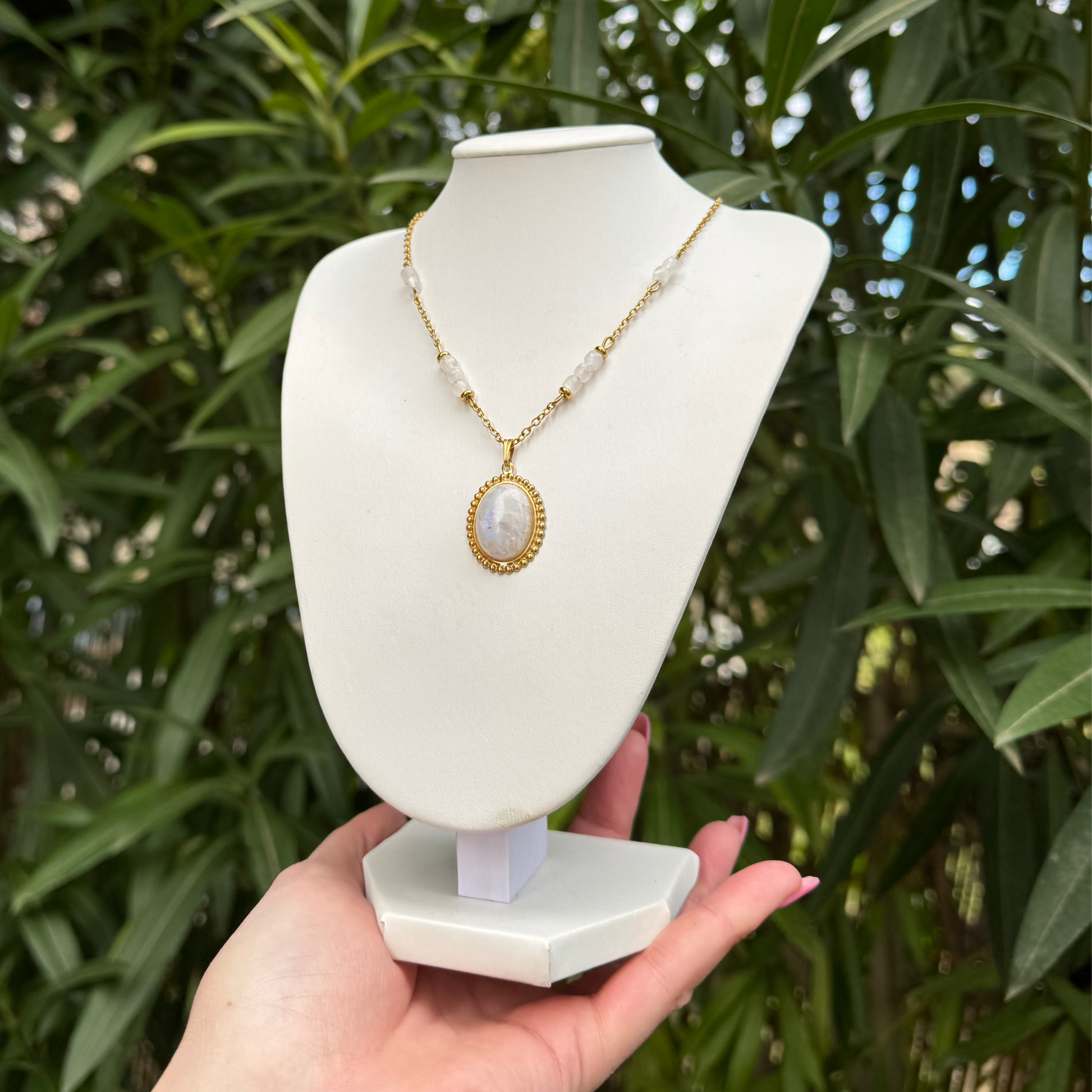 Collier en acier inoxydable fait main accompagné de perle de pierre de lune en 4 mm carrées facettées et d'un pendentif en pierre de lune.