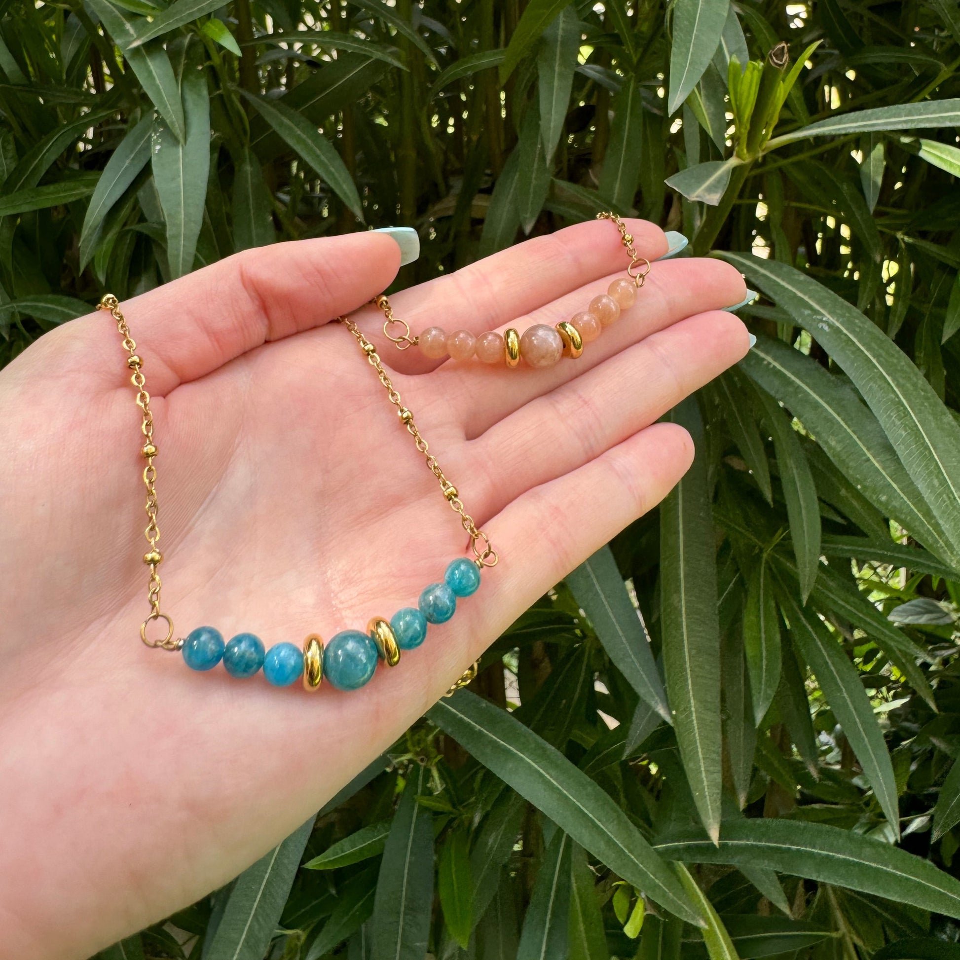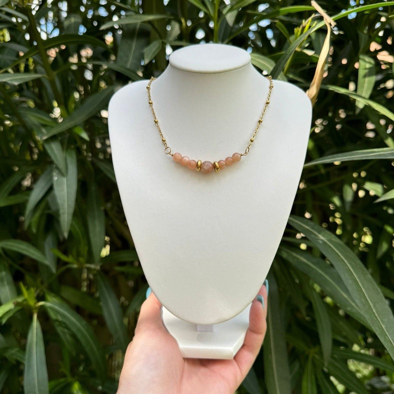 Collier en acier inoxydable fait main accompagné de perle de pierre de lune pêche en 6 et 8mm.