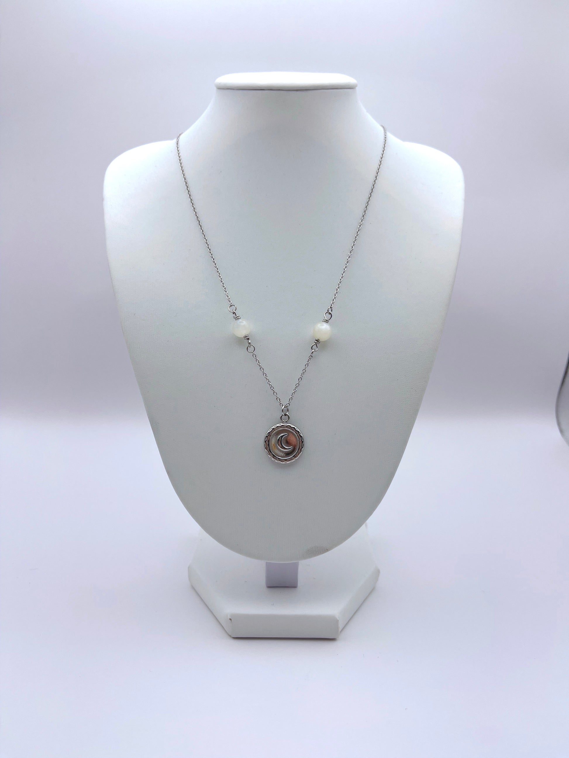 Collier en acier inoxydable fait main accompagné de perle de pierre de lune et pendentif lune.