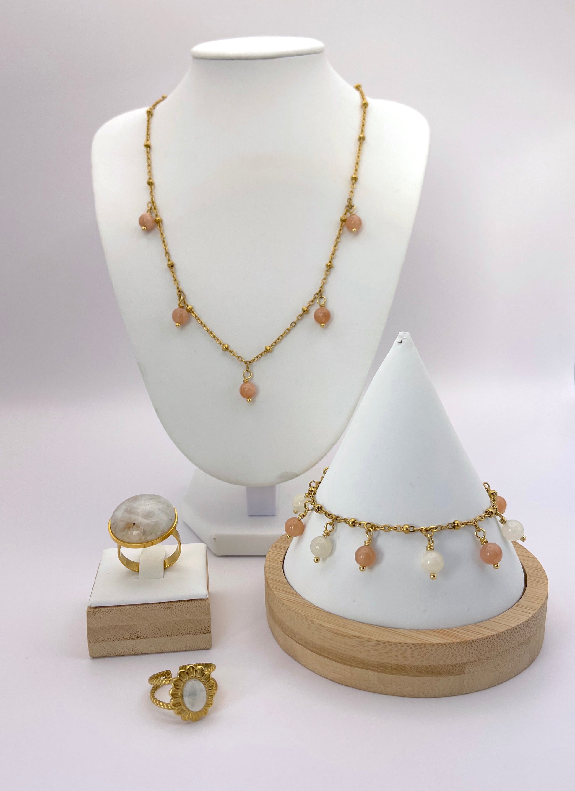 Pierre de lune : Pierre de la féminité, elle harmonise votre énergie féminine. Elle repousse les mauvaises intentions extérieures, favorise le sommeille et joue un rôle sur fertilité et la protection de la maman et du bébé lors d'une grossesse.