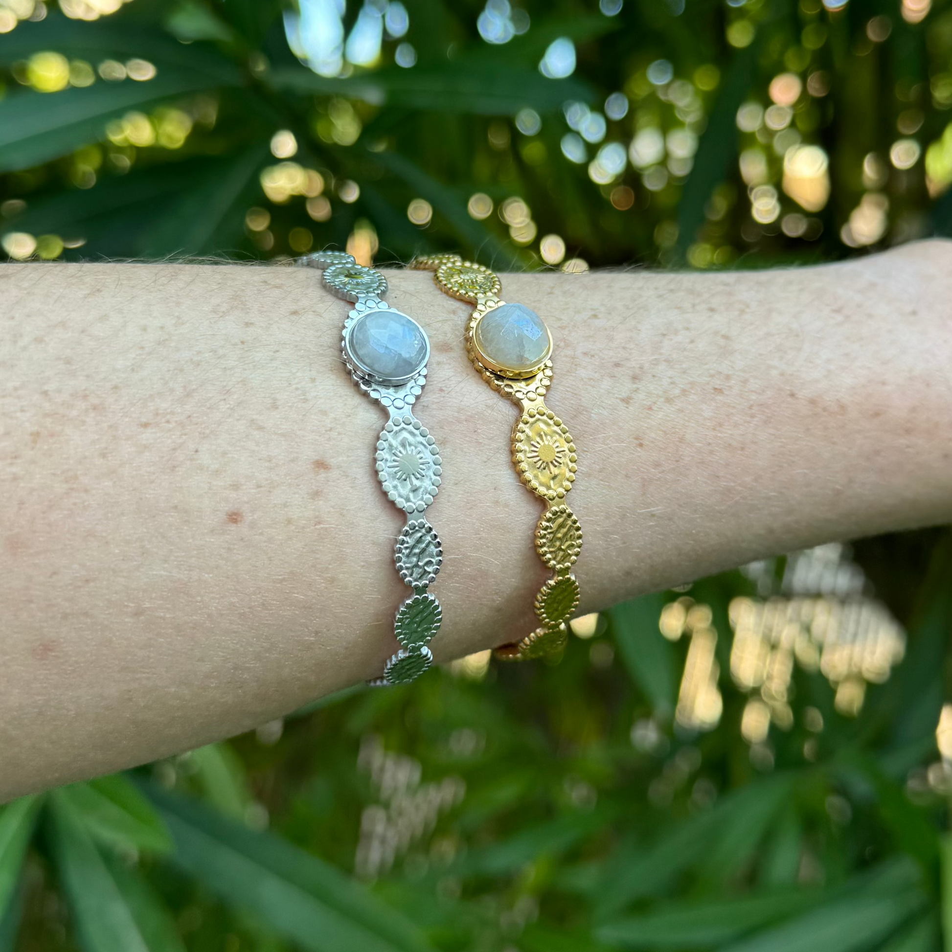 Jonc en acier inoxydable motif soleil accompagné de pierre de lune blanche.