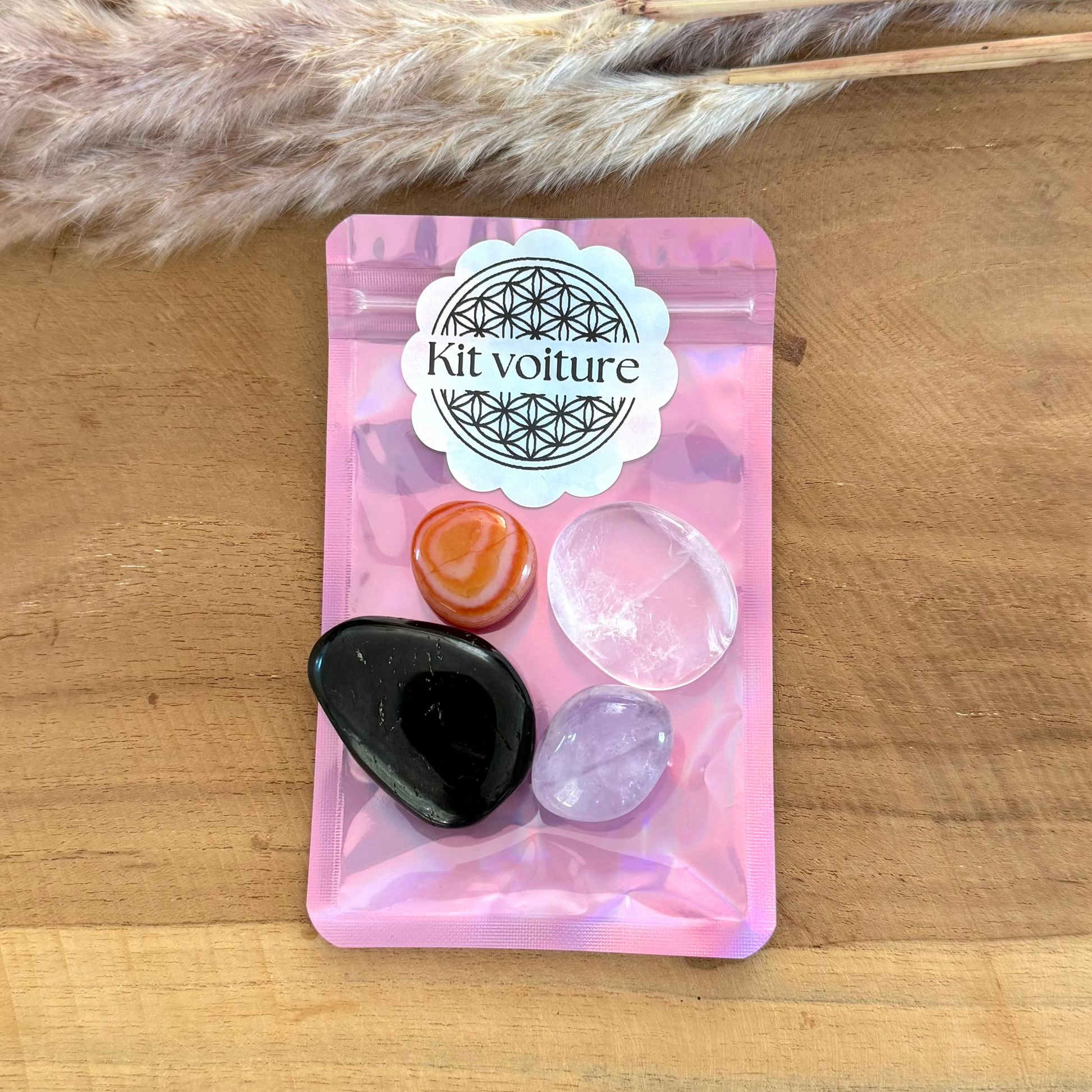 Kit pour la voiture en pierres naturelles composé de 4 pierres : Tourmaline noire, Cristal de roche, Améthyste et Cornaline.