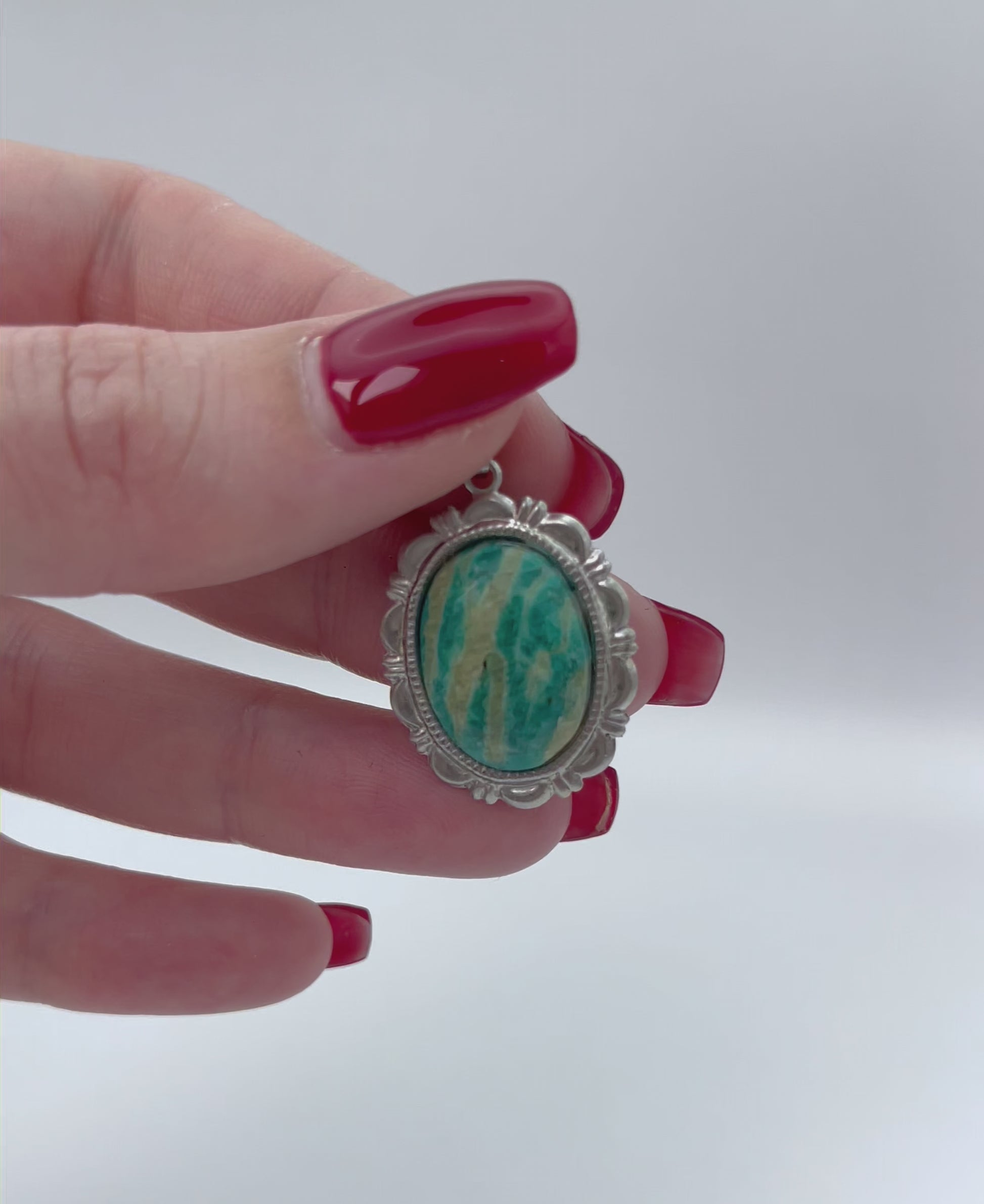Pendentif en acier inoxydable argenté accompagné d'amazonite.